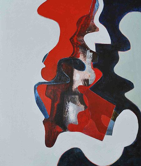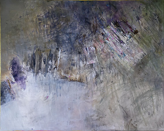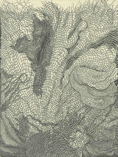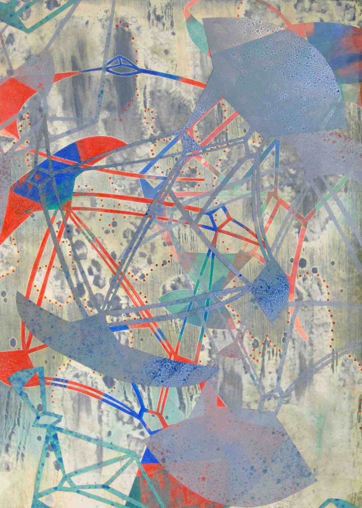 Abstract curvilinear shapes carve-out a rocklike three-dimensionality in my pieces. Rich colors in acrylic paint and India ink conflict with the areas that are translucent, allowing marks and textures to come through.