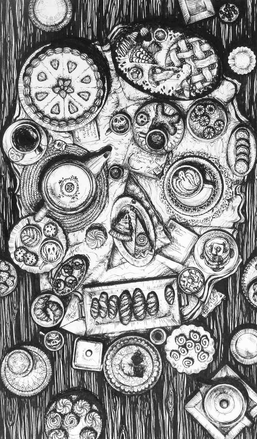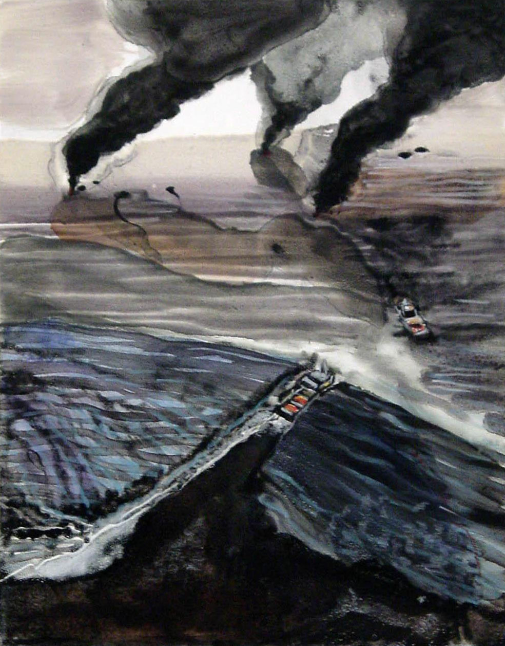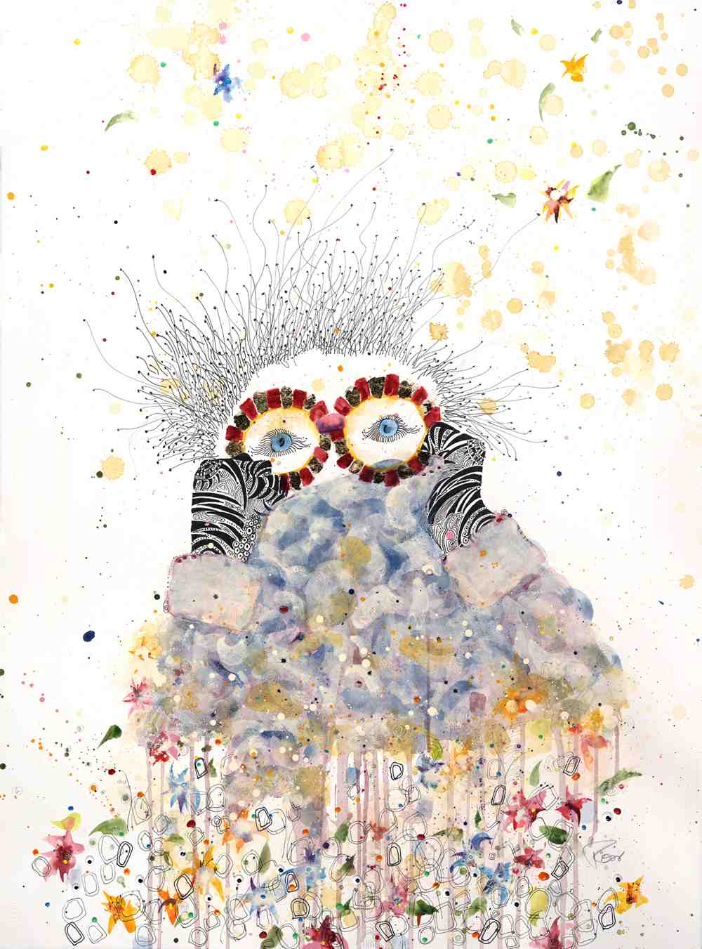 This is my first recollection: a fascination with the juxtaposition of situation and parts. This has continued to expresses itself in my art. This work explores the disconnectedness of my thoughts—so I like pushing and pulling the tension using ink and paint…I create the cause of the risk within the “watching the paint dry —anticipation.