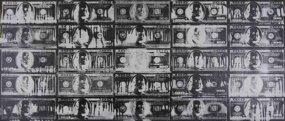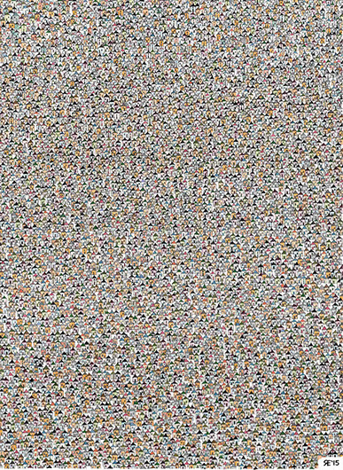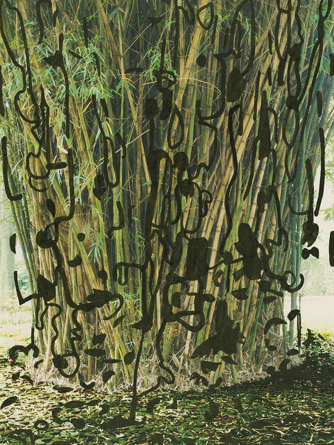 Dark Money is produced with silkscreen ink and aerosol paint on paper. The images are screen-printed with black silkscreen ink backwards on paper. The printed side of the sheet is painted with an aerosol can to various degree and position. The unprinted and unpainted side of the sheet reveals the paint bleeding through the paper where the screen printing didn’t block it out. Individual pieces are arranged and mounted to board.