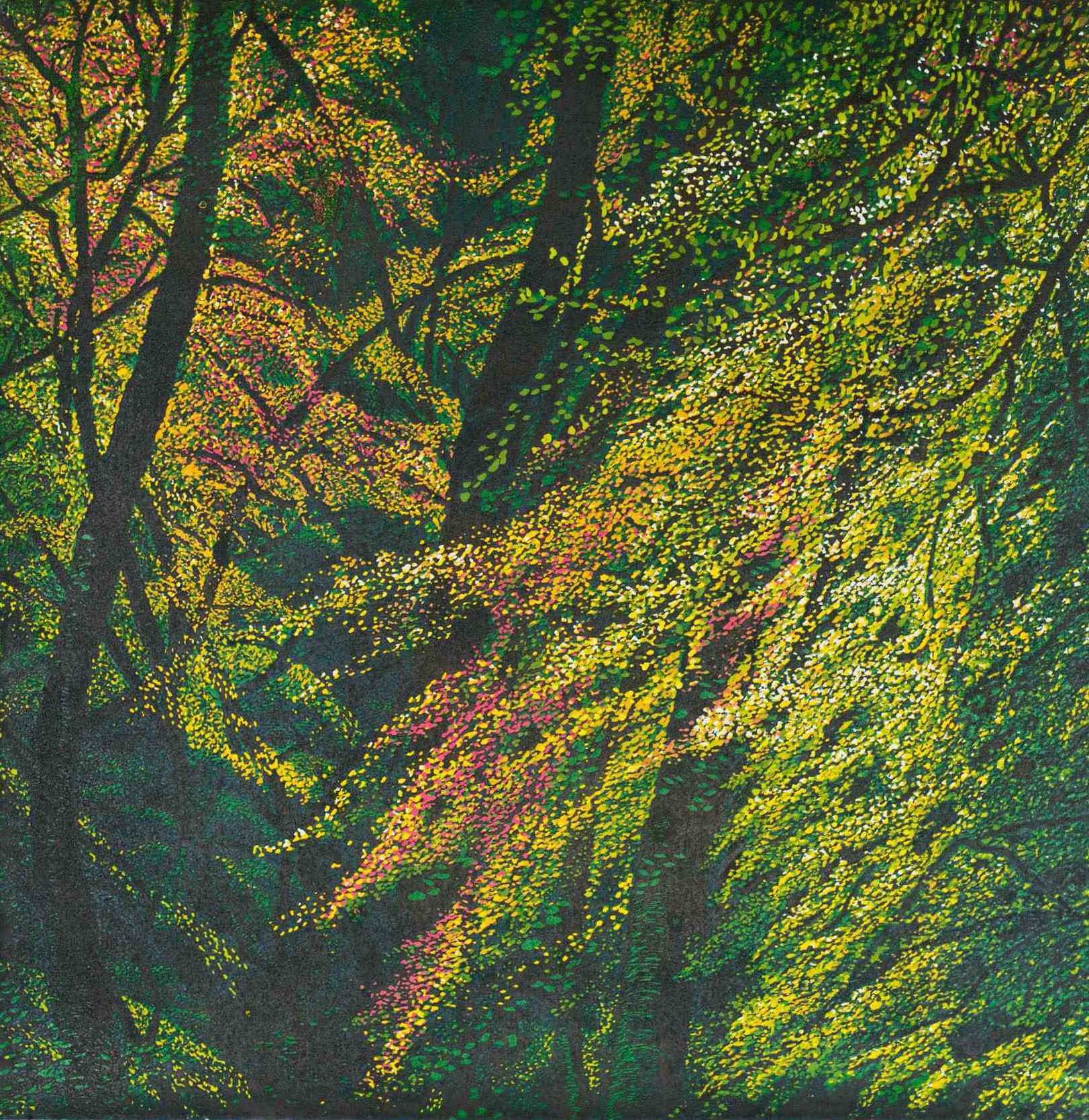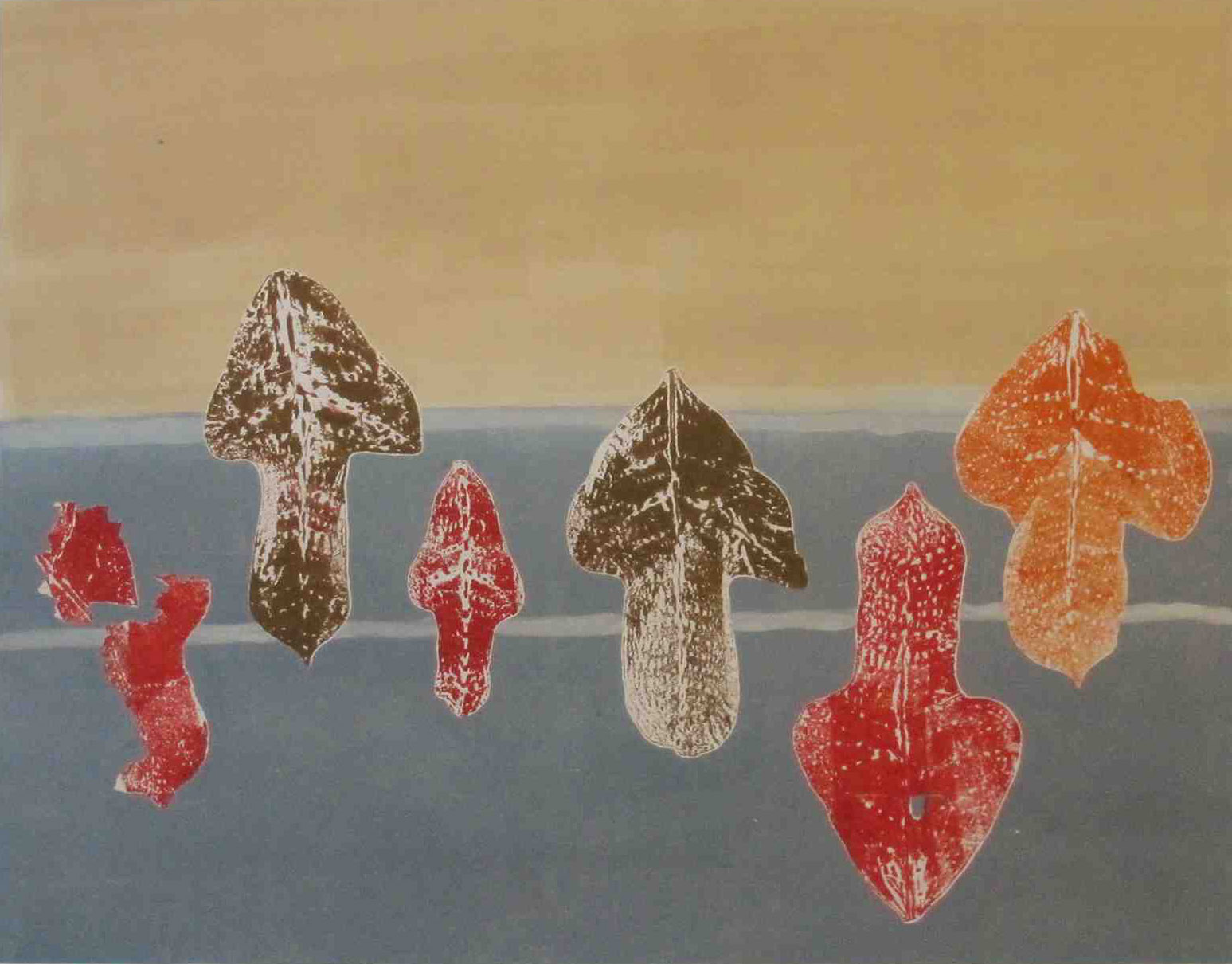 The reduction method is a printmaking technique used to create a multicolored print with the use of a single block. For each color pass the artist removes more material from the block. Color will not transfer from the block to the paper where the material is removed so the image of the removed material will preserve the color used in the previous pass. Each color is printed on top of previous color. The artist must print the entire edition before going to the next color pass. The image slowly emerges while the actual block is destroyed. A reduction print can therefore never be reprinted. Patel’s reduction print editions are always either five or six prints.