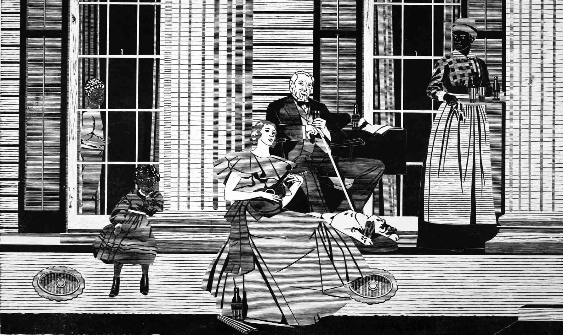 The original, idealized images that these advertisements featured are challenged and expanded in the black and white woodblock prints, perhaps showing a more accurate reality. Research into many African-American family trees can reveal multiple generations where children were born to slave women and fathered by slave owners. This history played a significant role in shaping America, both economically and socially, and has had a lasting impact on both individual families as well as America’s complex social fabric.