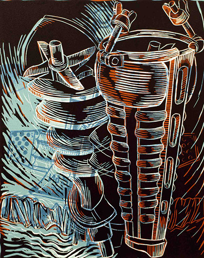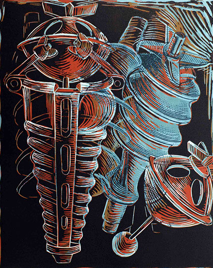 Since 2000, I have focused my studio practice on the reduction woodcut. I find its sculptural physicality, in combination with its working immediacy, very appealing. I am exceedingly seduced by its inherent quality requiring the gradual destruction of the matrix during the creation of the work of art. The reduction woodcut print is born out of a creative one-way voyage that provides constant challenges and requires total commitment to any decision made. The reduction woodcut does not tolerate any detours or returns. Consequently, the reduction woodcut is always a unique, fresh, direct, powerful, and honest expression of the artist’s creative intent.