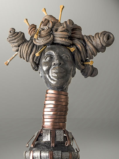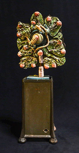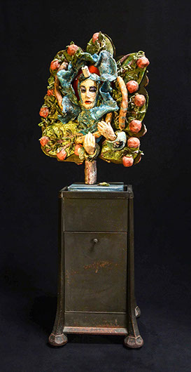 The emotionally esoteric Soul Circus by Gina M. and Deirdre Sullivan-Beeman, represents humanity’s naïveté and mystical qualities. The elephant (the mystical) offers protection and holds the innocent young girl (naïveté) “tight as a drum” in his belly as the chaos of life ensues. The piece combines modern day ceramics with traditional oil and egg tempera painting techniques.