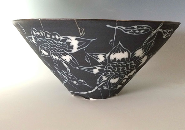 I learned clay in LA working in porcelain with freehand incising on slip, applying glaze only inside. The ring is cone 10. The sunflowers celebrate our connection with nature.