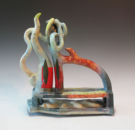 I sketch many of my ideas before I build them, coming up with titles that will hopefully get the idea across to the viewer. Sometimes the titles are unnecessary, as the viewer can recognize what is going on in the scene, or even make up their own interpretation. I typically build my figures from the ground up, using coils of clay and forming, cutting and paddling the form as I work my way up the figure. The pieces are finished with glazes, underglazes and stains, which I sponge or brush on in layers, building up color and texture. My favorite firing method is Raku, which imparts a beautiful smoky and somewhat unpredictable surface that ties the colors together well.