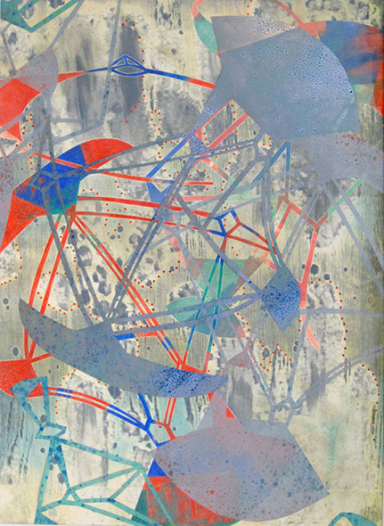 Abstract curvilinear shapes carve-out a rocklike three-dimensionality in my pieces. Rich colors in acrylic paint and India ink conflict with the areas that are translucent, allowing marks and textures to come through.