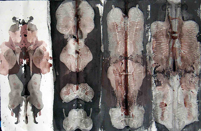 This is my first recollection: a fascination with the juxtaposition of situation and parts. This has continued to expresses itself in my art. This work explores the disconnectedness of my thoughts—so I like pushing and pulling the tension using ink and paint…I create the cause of the risk within the 'watching the paint dry' —anticipation.